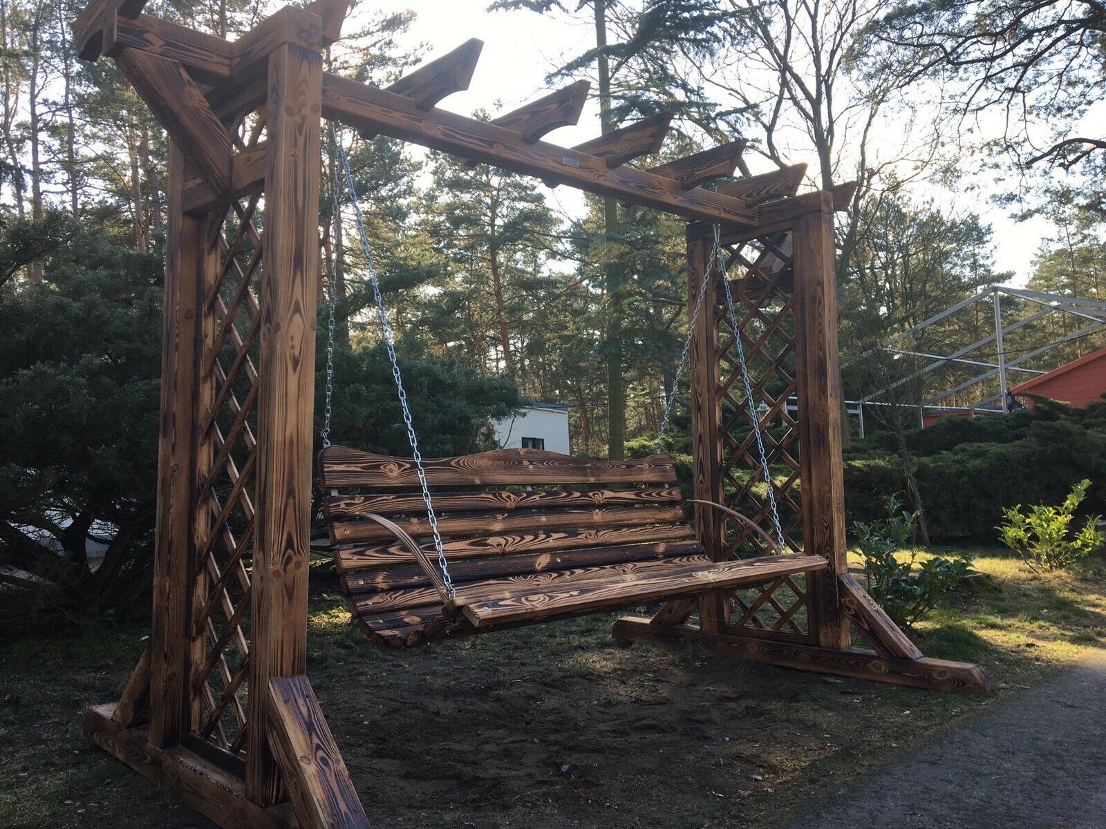 Sitzgruppen aus Holz sind eine beliebte Wahl, wenn es darum geht, einen natürlichen und zeitlosen Charme in den Außenbereich zu bringen. Unsere Sitzgruppen sind massiv und rustikal. - Hollywoodschaukel aus Holz